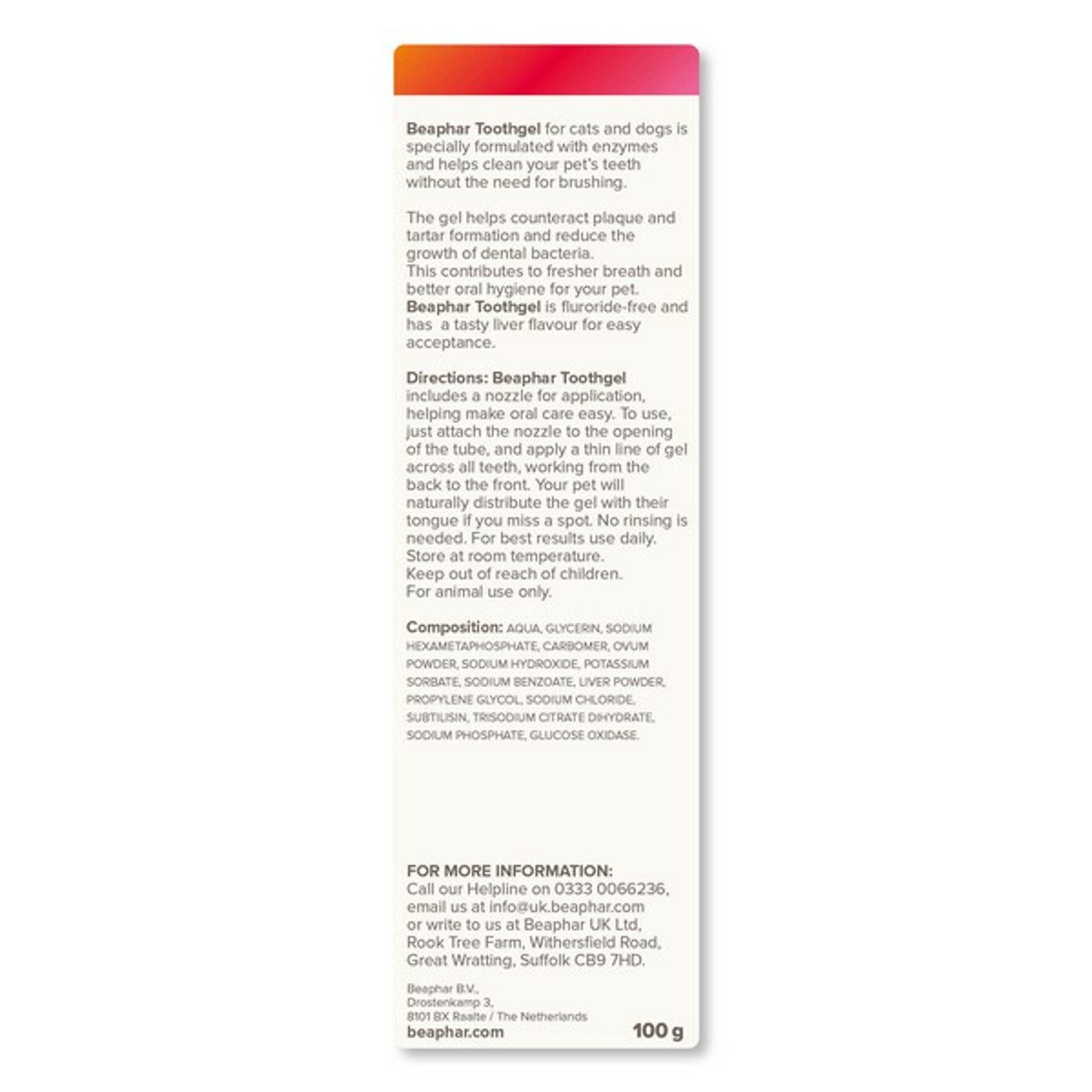 Friendly liver-flavoured gel uses two active enzymes to fight plaque and freshen breath without brushing. Protease breaks down plaque proteins while glucose oxidase creates a mild antibacterial action to reduce bacteria. Fluoride-free and gentle if swallowed, it avoids foaming agents found in human toothpaste that upset pet tummies. Supplied in a 100g tube with a long nozzle for easy, no-brush application.