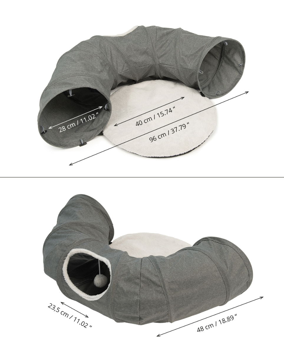 This stylish grey tunnel gives curious cats the perfect mix of play and relaxation. With a central peek-a-boo hole and a dangling plush ball toy, it’s built for pouncing, stalking, and surprise attacks. The round padded cushion creates a snug spot for lounging once the mission’s complete.