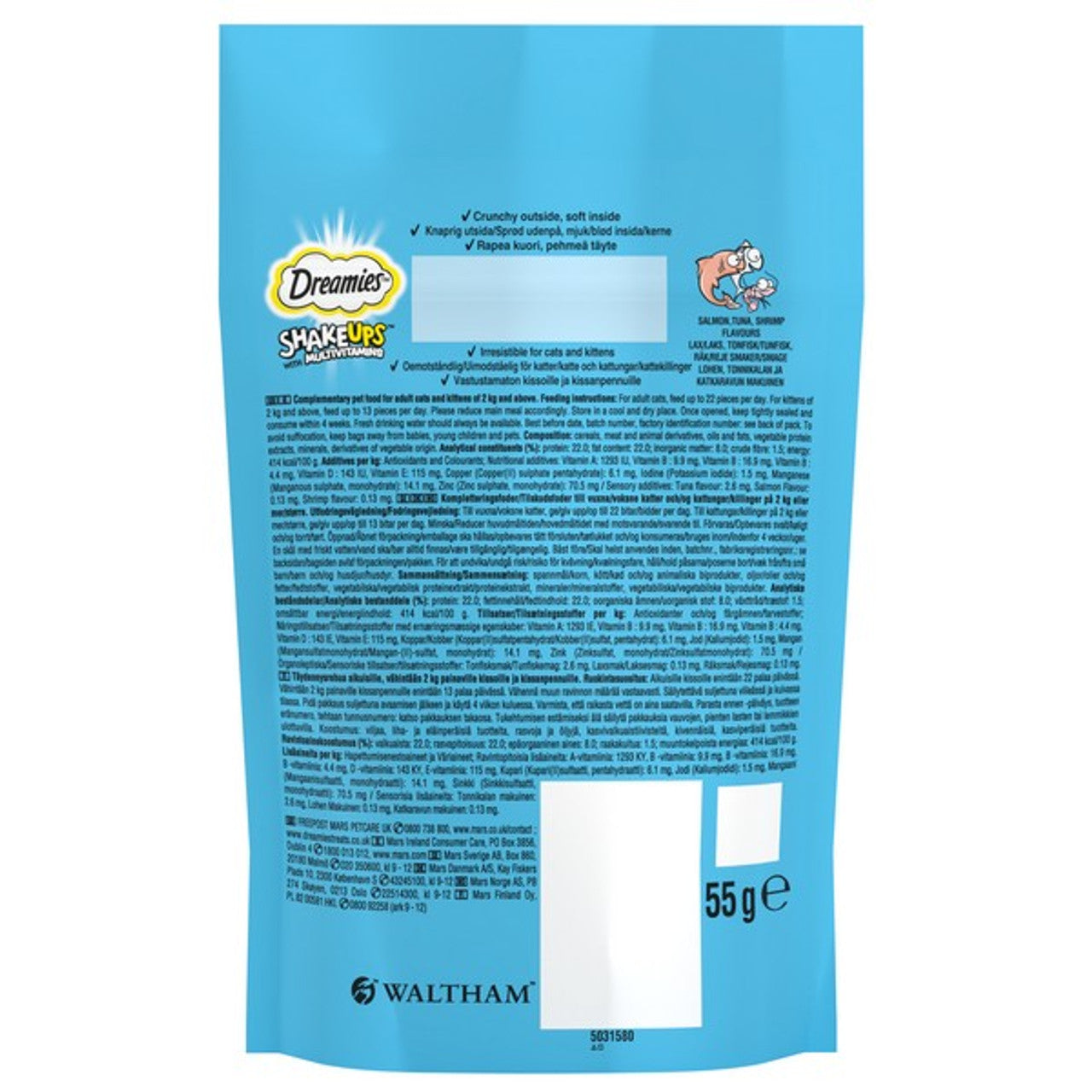 Crunchy seafood-flavoured bite-sized treats cats adore, enriched with multivitamins to support daily wellbeing. Irresistible aroma and a soft centre keep picky eaters engaged and work brilliantly as training rewards. The handy 55g pouch fits cupboards and travel kits for on-the-go pampering. Suitable for cats and kittens – feed sparingly as a tasty complement to a balanced diet.