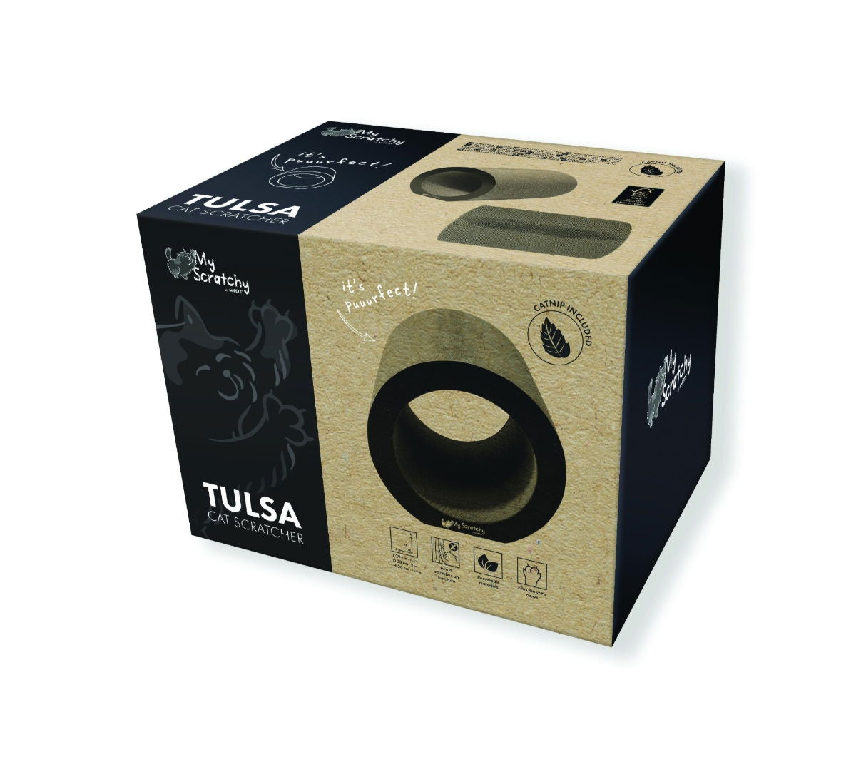 A cosy corrugated cardboard tunnel that satisfies a cat's scratching instincts while doubling as a hideaway, keeping claws away from your furniture. The dense, layered cardboard surface is durable yet fully recyclable for guilt-free play. Lightweight and portable, the Tulsa tunnel needs no assembly and can be positioned anywhere in the home. Cats adore the rounded tube for naps, ambushes and play sessions, making it a practical, eco-friendly addition to cat furniture.