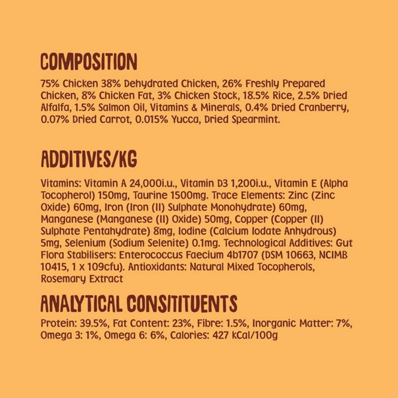 A complete, natural dry food for adult cats with 75% chicken (freshly prepared and dehydrated) for premium protein and easy digestion. Gentle cooking and added probiotics make this recipe gut-friendly and ideal for sensitive stomachs, with no artificial colours, preservatives, added sugar or salt. Balanced with rice, salmon oil, alfalfa, cranberries and essential vitamins and minerals to support skin, coat and overall vitality. Packed in a handy 2.5 kg pouch, this hypoallergenic, UK-made recipe is a purr-fect everyday choice for fussy felines.